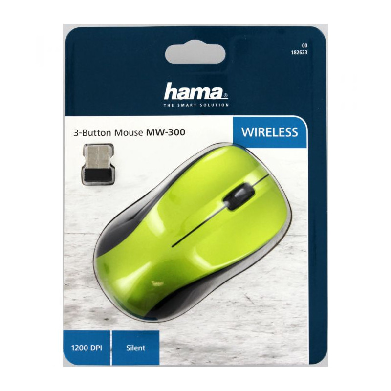 Hama MW-300. Forma: Ambidestro. Tecnologia de detecção de movimento: Ótico, Interface de dispositivo: RF Wireless, Resolução do movimento: 1200 DPI, Tipo de botões: Botões premidos, Número de teclas: 3, Tipo de scroll (deslocamento): Roda. Cor do produto: Verde