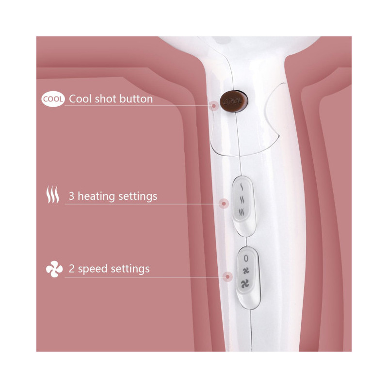 - Possui 3 configurações de temperatura e duas taxas de fluxo de ar localizadas na alça do secador para facilitar a troca. Com as diferentes temperaturas e intensidade do ar, você pode definir ou criar qualquer penteado, além disso, seu botão de ar frio permite que o penteado seja fixado rapidamente sem danificar o cabelo.